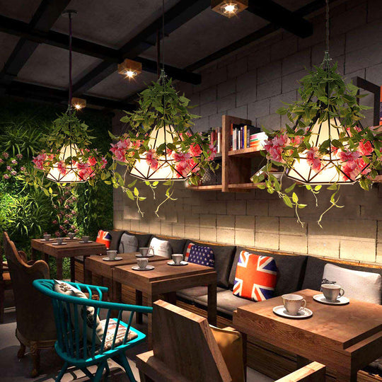 Luminaire suspendu à cage en diamant à 1 lumière - Blanc/rouge avec décoration florale artificielle pour une ambiance d'entrepôt