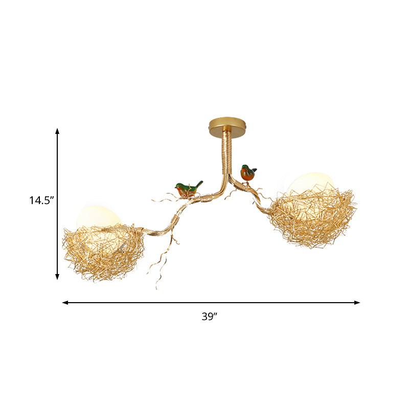Suspension lustre boule en verre blanc lait Artistry avec oiseaux et nid en aluminium cousu à la main - Lampe suspendue dorée à 1/2/3 lumières