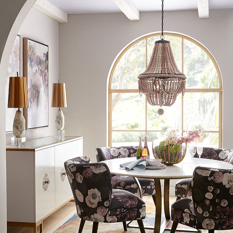 Ce lustre empire découpé au laser a 8 têtes et est en bois. L'abat-jour est rose et bleu, et le luminaire mesure 31,5" de haut avec une largeur de 19,5". Il utilise des ampoules E12/E14 (non incluses) et est conçu pour une utilisation avec 220V-240V ou 110V-120V.