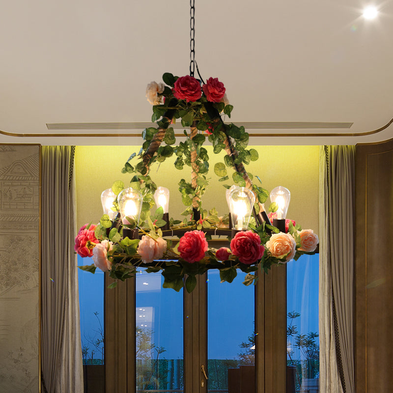 Aldhanab - Lustre en métal à 6 ampoules apparentes de style loft, suspension en métal noir avec anneau et pétales artificiels décoratifs