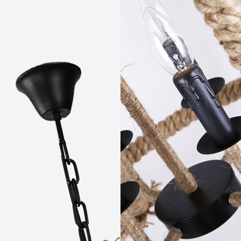 Lustre beige à 4 lumières : Suspension cylindrique en corde traditionnelle pour salle à manger