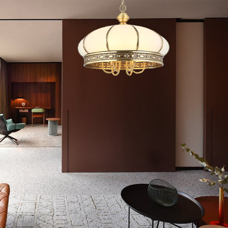 Lustre suspendu colonial ovale avec 6 abat-jour en verre blanc givré doré