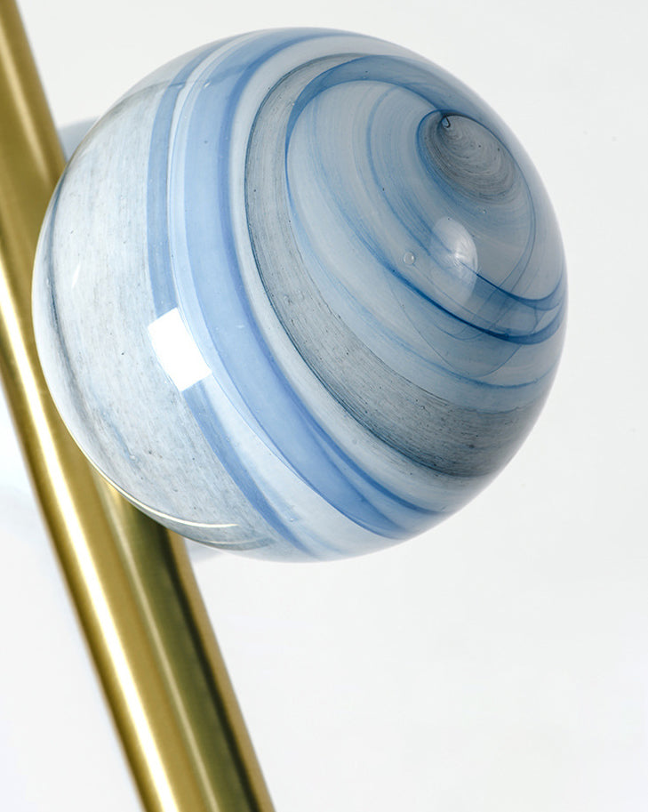 Ce lustre moderne et minimaliste comprend un luminaire linéaire avec un abat-jour sphérique en verre dépoli. Le lustre a trois lumières, chacune avec sa propre base à deux broches. La lumière est enfermée dans un cadre en métal avec une finition en or noir. Le lustre est suspendu à un cordon et peut être monté au plafond.
