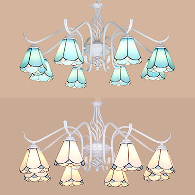 Blue/White Multi-Light Cone Chandelier: Metal Chain Glass Tiffany Pendant Light For Living Room
