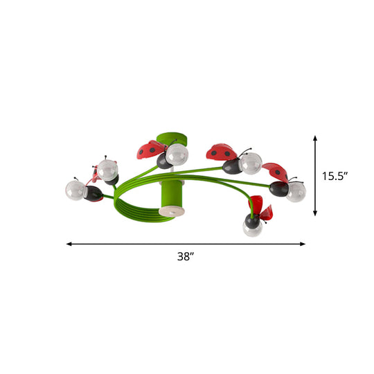 Semi Flush Kids 6-Light Metal Ceiling Lighting Fixture - Green Twisted Vine Design With Butterfly
