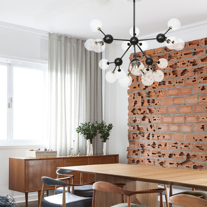 Ce produit est une lampe de lustre avec un design spoutnik. Il est composé de métal et de verre et est disponible en trois couleurs : ambre, transparent et gris fumé. Il a trois tailles différentes : 13", 27,5" et 34" de large. Il est livré avec une largeur de canopée de 5". Il a une tension de 110V-120V et 220V-240V. La base de l'ampoule est G4 et le type de lumière est LED.