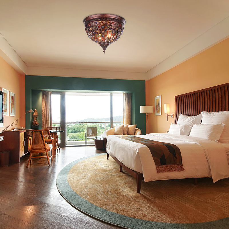 Ce produit est un plafonnier encastré en métal avec une finition en cuivre patiné. Il comporte deux luminaires en forme de dôme, chacun avec un accent de perles de cristal. Le luminaire est conçu pour être utilisé avec des ampoules LED, à incandescence ou fluorescentes. Il est disponible dans des tailles de 10 à 14 pouces de diamètre et mesure 13 pouces de large et 10 pouces de haut.