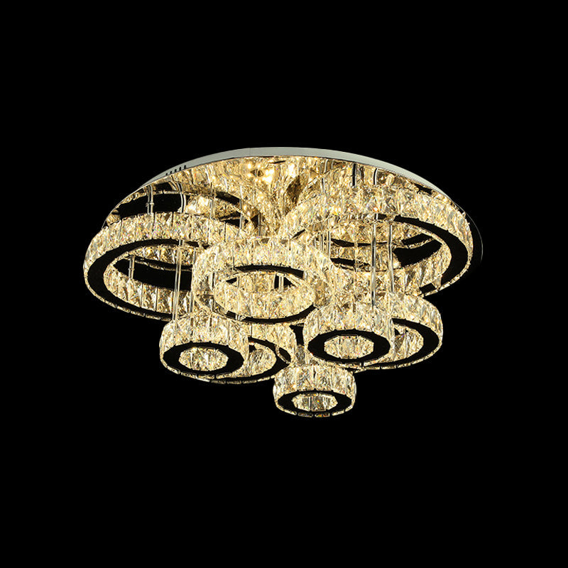 Ce produit est un plafonnier encastré moderne en cristal transparent. Il comporte trois niveaux de cercles et est livré avec un auvent chromé. La lumière est LED et sa tension est de 220-240 V. Il a une base d'ampoule SMD.