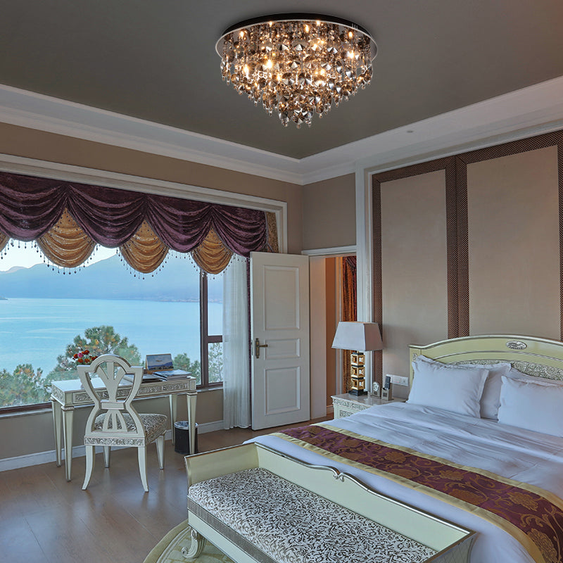 Ce produit est un plafonnier LED à gradins gris fumé avec perles de cristal à éclairage blanc/chaud vintage. Il mesure 16" de large et 23,5" de haut. La lumière est alimentée par des ampoules LED G4 avec une tension de 110V-120V ou 220V-240V. Il est fait de cristal et a un style moderne. La lumière est blanche chaude et le luminaire est encastré.