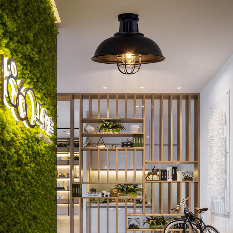 Plafonnier cage métallique vintage avec montage semi-encastré et abat-jour en forme de bol en noir