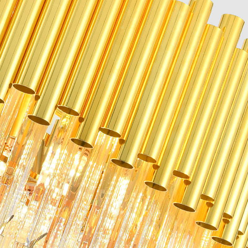 Ce lustre est composé d'une structure en métal et d'un abat-jour rond décoré de détails en laiton. L'abat-jour est composé de blocs de cristal qui émettent une lumière LED brillante. Ce lustre est parfait pour ajouter une touche d'élégance à n'importe quelle pièce.