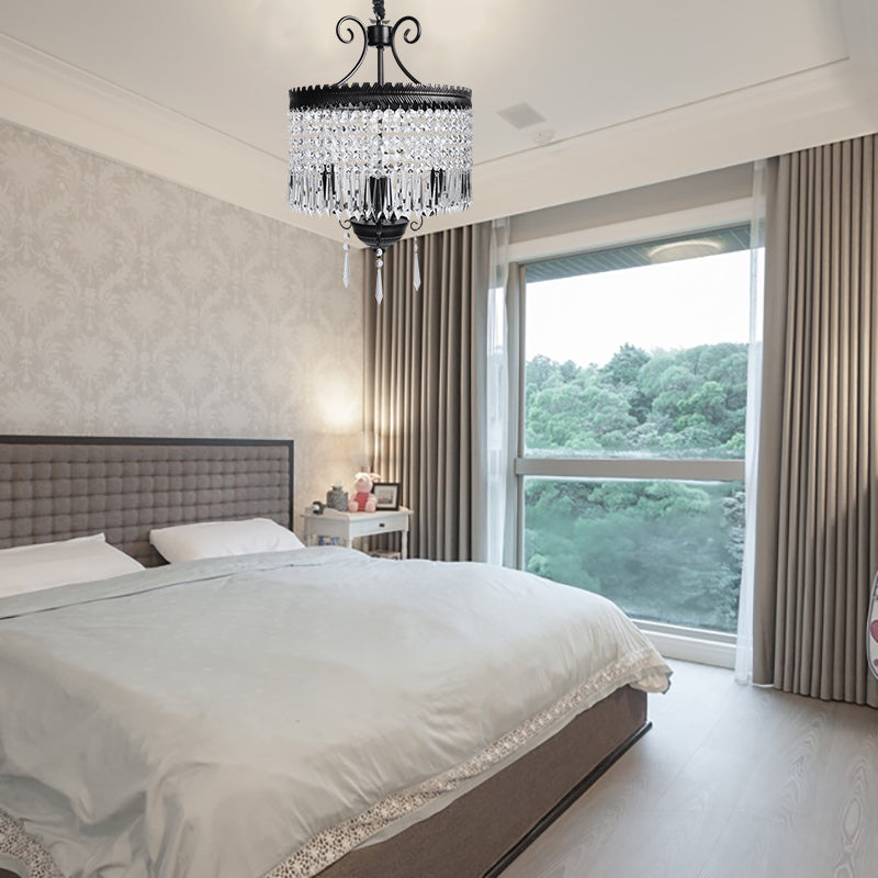 Modern Crystal Beaded Pendant Light With 3 Lights Black Drum Shade Chandelier Lamp