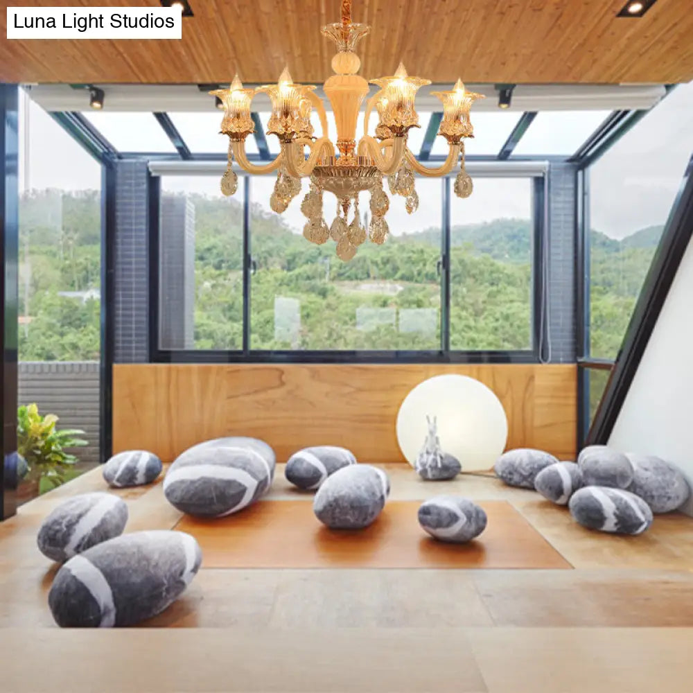 Suspension traditionnelle en forme de fleur dorée avec cristal K9 transparent - Têtes 6/10 - Idéale pour le salon - Disponible en 29,5"/35,5" W