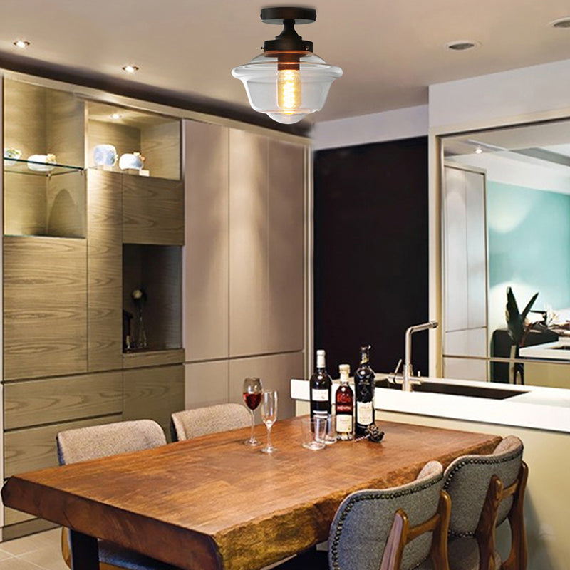 Ce produit est un plafonnier industriel en verre transparent noir à 1 lampe pour salle à manger, de 6"/8" de large. Il est en verre et a une finition noire. La tension est de 220V-240V 110V-120V et la base de l'ampoule est E26/E27. Le type d'éclairage est LED/Incandescent/Fluorescent.