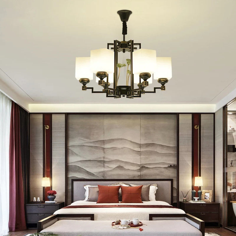 Ce produit est un lustre en métal de style traditionnel disponible en options de 6, 8 ou 10 lumières. C'est une suspension de salle à manger qui vient en noir. Le lustre a un abat-jour en verre dépoli et est fabriqué en métal. La tension de ce produit est de 220V-240V ou 110V-120V. Le type de lumière est soit LED, incandescent ou fluorescent.