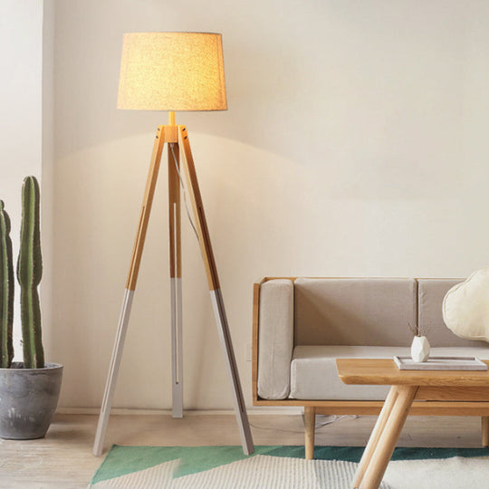 Modern 3-Legged Drum Shade Floor Light - Black/White Fabric Wood Base For Living Room White