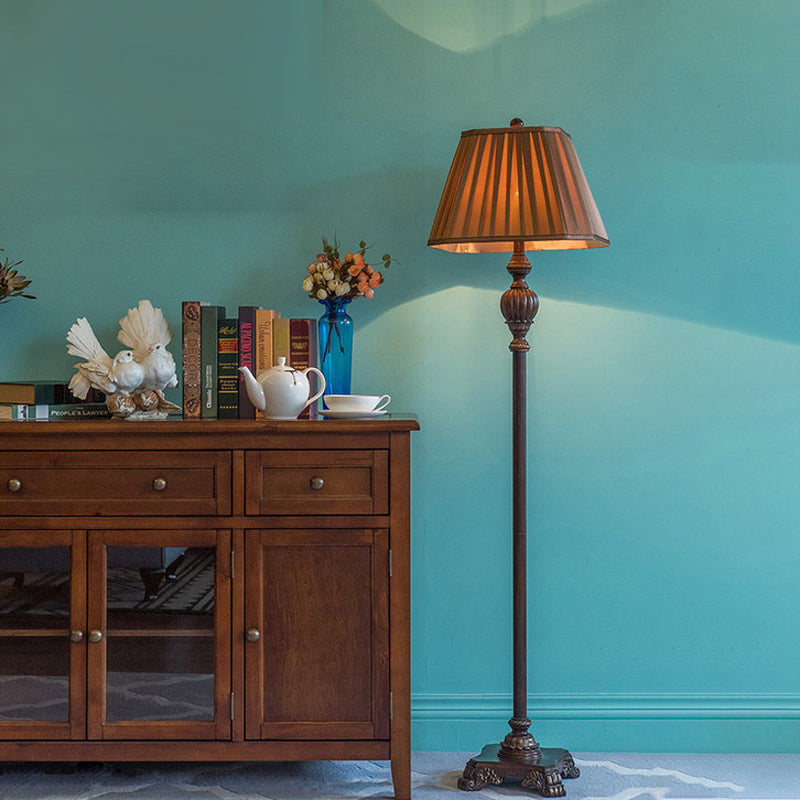 Lampadaire classique en tissu plaqué café foncé avec base en bois - Abat-jour trapézoïdal, 1 ampoule