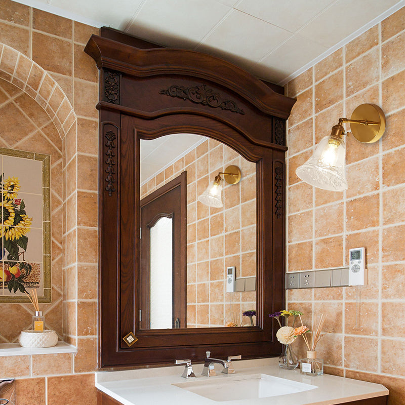 Applique murale cloche en laiton rustique : verre transparent, luminaire de chambre à coucher avec détail de fleurs