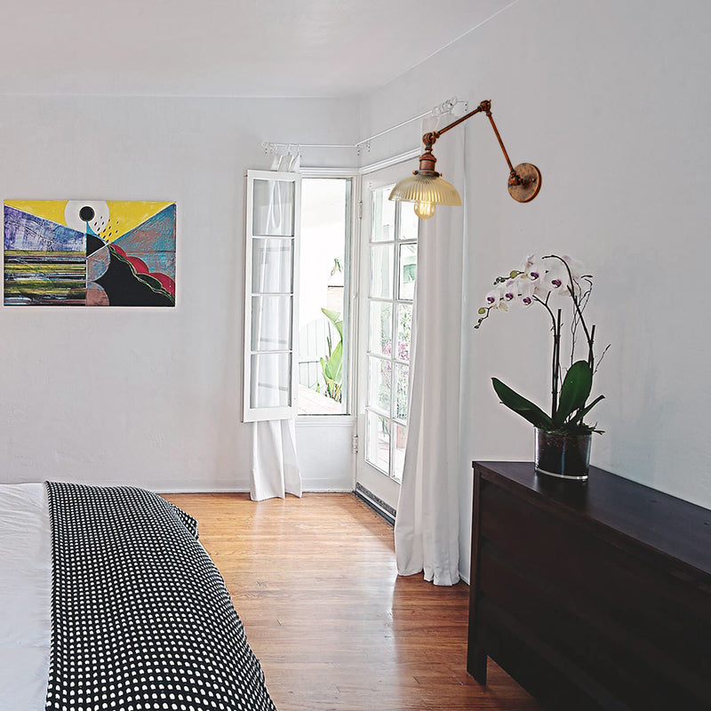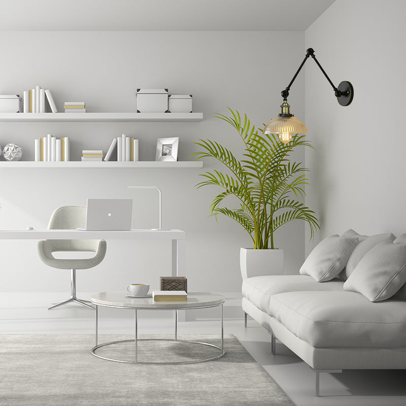 Applique murale industrielle à bras oscillant en laiton antique/noir/rouille avec abat-jour en verre nervuré - Luminaire de salon parfait
