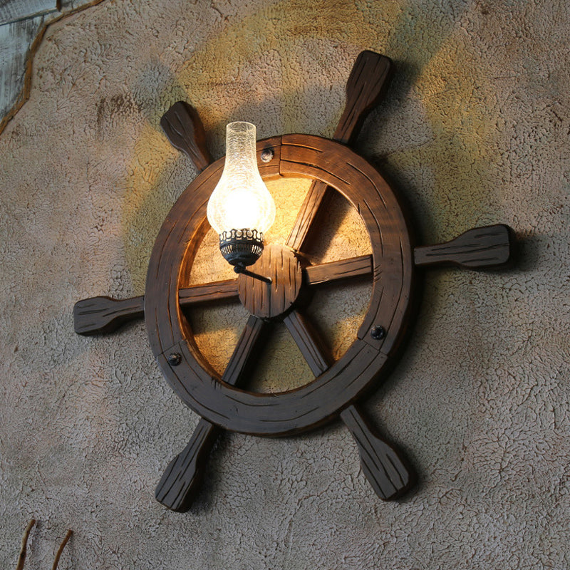 Applique Murale Vase en Verre Craquelé Ambre Rétro Noir avec Déco Gouvernail en Bois