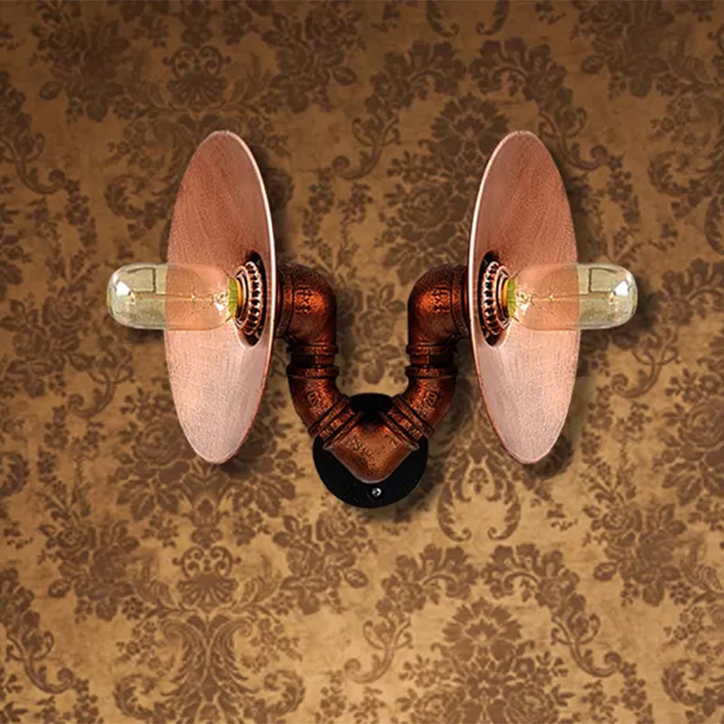 Rustic Dark Rust Round Sconce Lighting Wrought Iron 2-Bulb Bedroom Wall Mount Light With Pipe