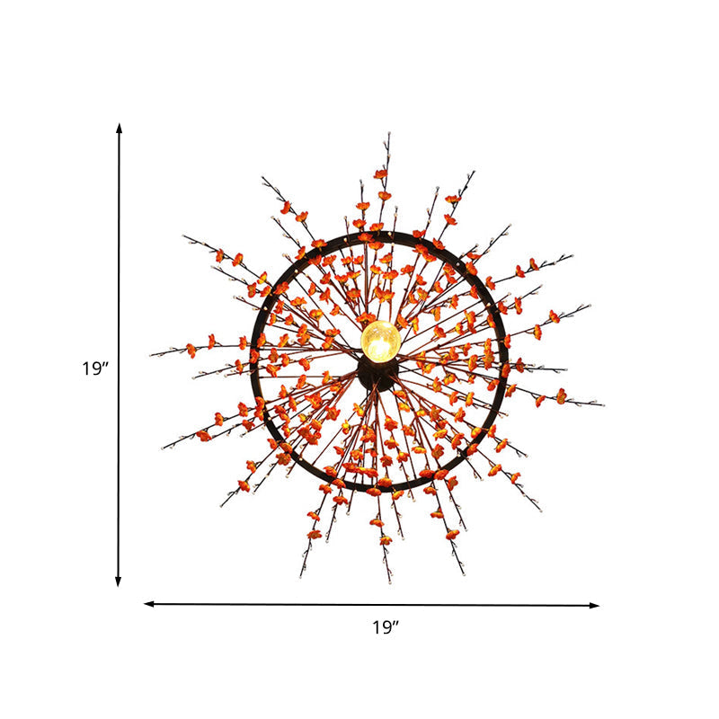 Cette roue d'applique murale en métal noir est une applique murale rétro à DEL à 1 ampoule. Il est livré avec une décoration de fleur de prunier. Il mesure 19 pouces de haut et a une largeur de 19 pouces. Le type de lumière est à LED et la puissance maximale de l'ampoule est de 39 watts. Il a une tension de 220V-240V ou 110V-120V. Il est électrique à câblage direct et a une température de couleur chaude. Le type de luminaire est une applique murale.