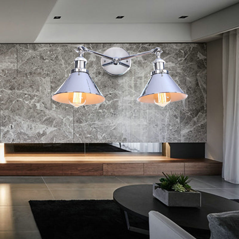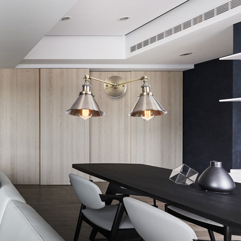 Applique murale vintage industrielle à 2 têtes de ferme en noir/laiton - Luminaire en fer à abat-jour conique