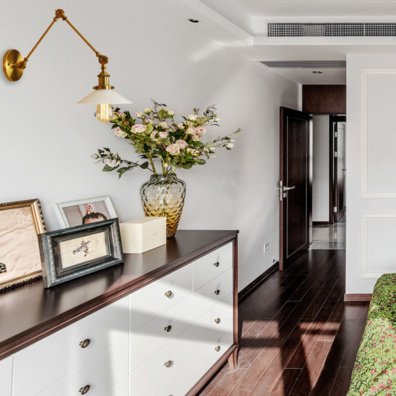 Ce produit, le luminaire industriel à 1 ampoule à cône d'éclairage en laiton de verre blanc pour chambre à coucher, est un luminaire mural qui est parfait pour n'importe quelle pièce de votre maison. L'élégant abat-jour conique en verre blanc est accentué par une finition en métal laiton, lui donnant un look industriel moderne. La lumière est compatible LED et est livrée avec une tension de 220V-240V 110V-120V. Il comprend également un matériau d'abat-jour en verre et une longueur de bras de 8". L'ampoule n'est pas incluse mais la base est E26/E27.