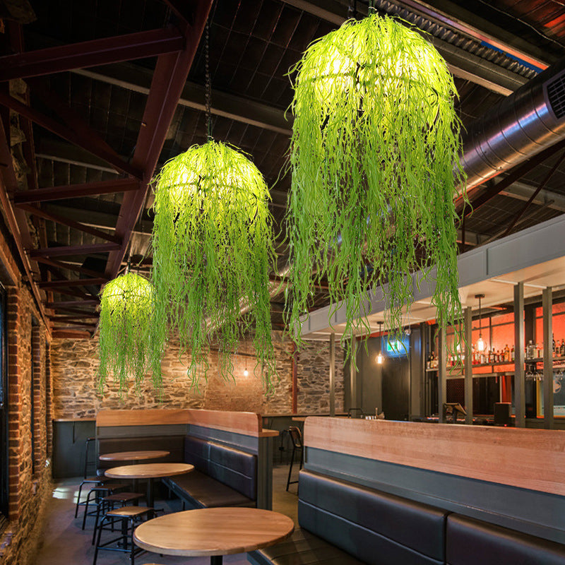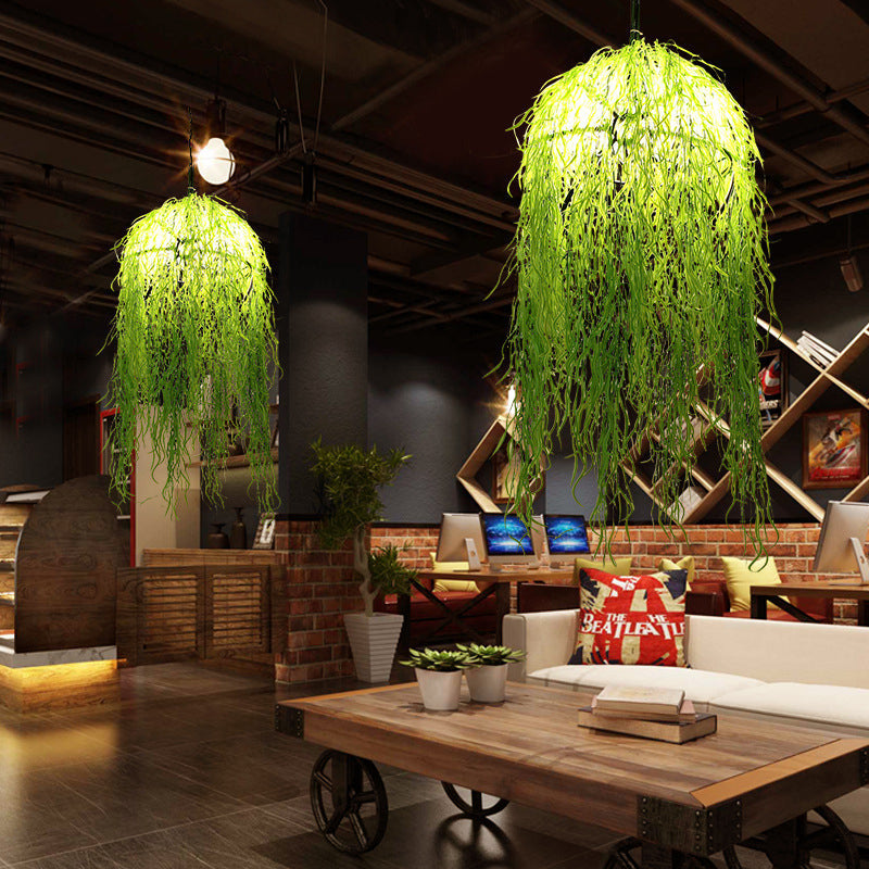 Lustre industriel en métal vert avec motif cloche et ornement en osier, 18"/21,5" de large - Plafonnier suspendu à 3 têtes