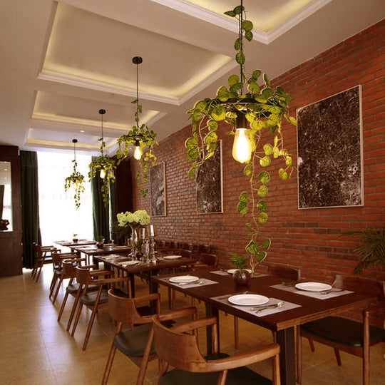 Retro Wagon Wheel Chandelier - Iron Pendant Light In Black 1/3/6-Light With Decorative Plant
