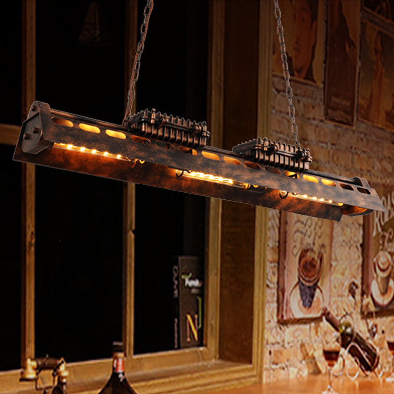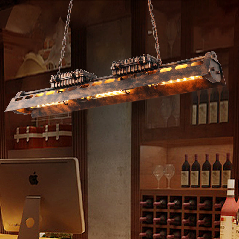 Luminaire linéaire vintage en métal rouillé avec 3 lampes suspendues pour plafond de bar