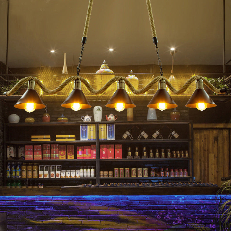 Wavy Hemp Rope Island Light Fixture: Rustic Bar Hanging With Black Cone Metal Shade