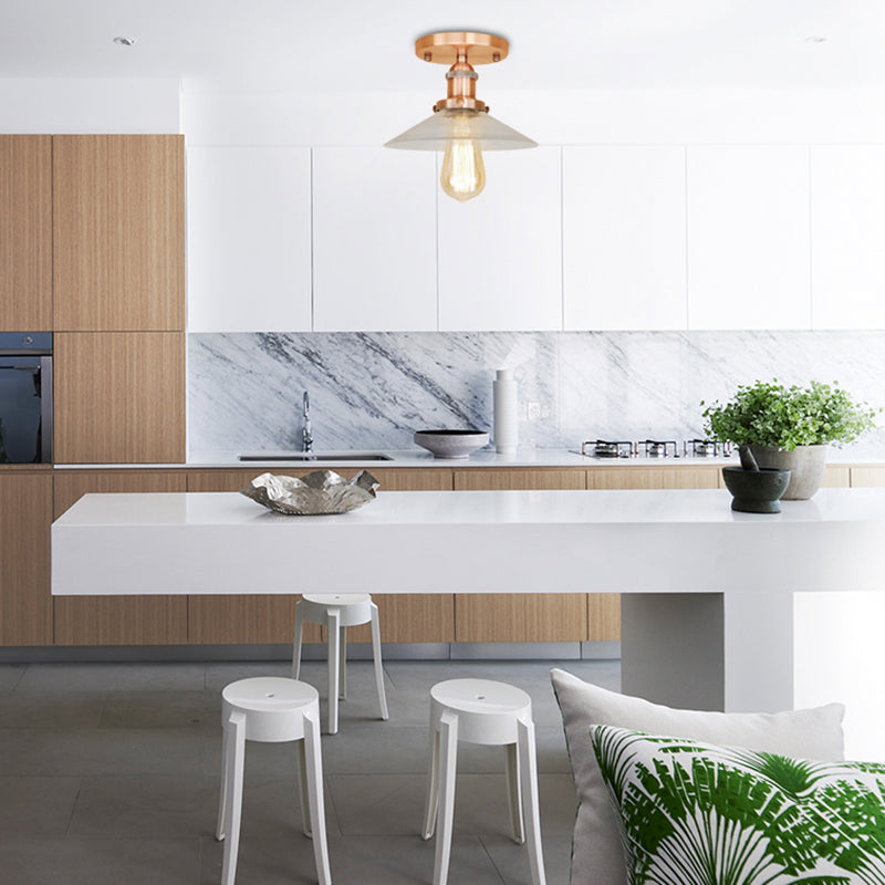 Le luminaire est disponible dans une variété exquise de couleurs telles que le noir, le laiton, le cuivre, le chrome, la rouille et le laiton satiné, qui complèteront à coup sûr votre décor existant. Le luminaire mesure 8,5 pouces de large, 5,5 pouces de haut et la largeur de la verrière est de 5 pouces. Il s'agit d'un luminaire semi-encastré et il convient à une taille de 5 à 9 pouces.
