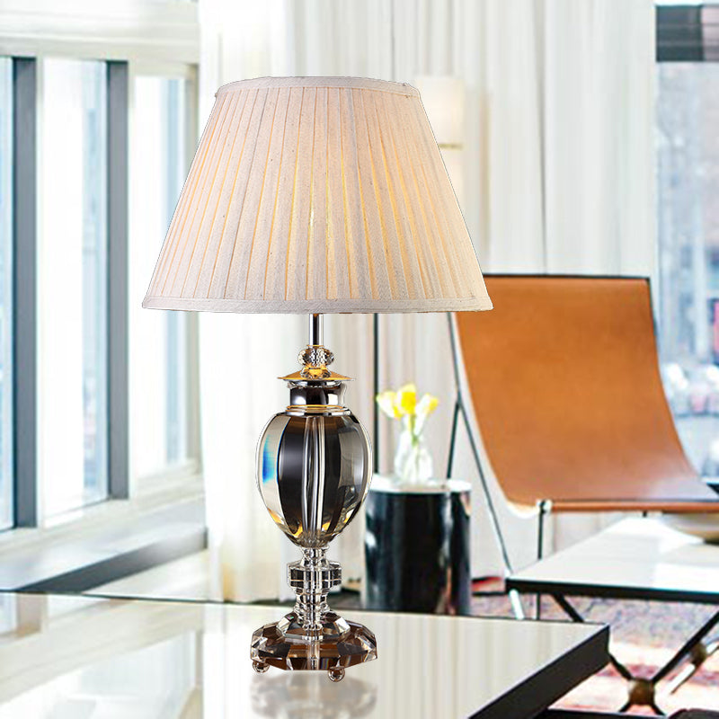 Fabric Nightstand Lamp With Crystal Base - Countryside Beige Pleated Lampshade Bedroom Table Light 1