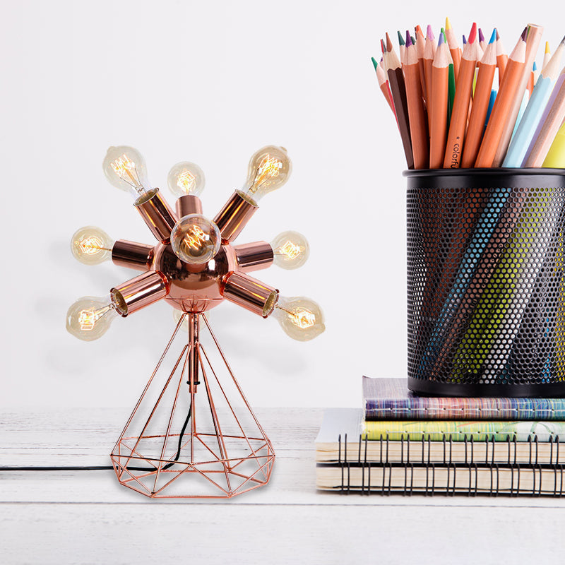 Ce produit est une lampe de table en métal à ampoule nue de style rétro à 6/9 têtes avec base en diamant en cuivre pour chambre à coucher. C'est un lampadaire de style industriel en métal avec une finition cuivrée. La lampe a une conception d'ampoule nue avec une base en forme de diamant. Il est évalué pour 220V-240V et utilise une base d'ampoule E26/E27. Le type de lumière est LED/Incandescent/Fluorescent.