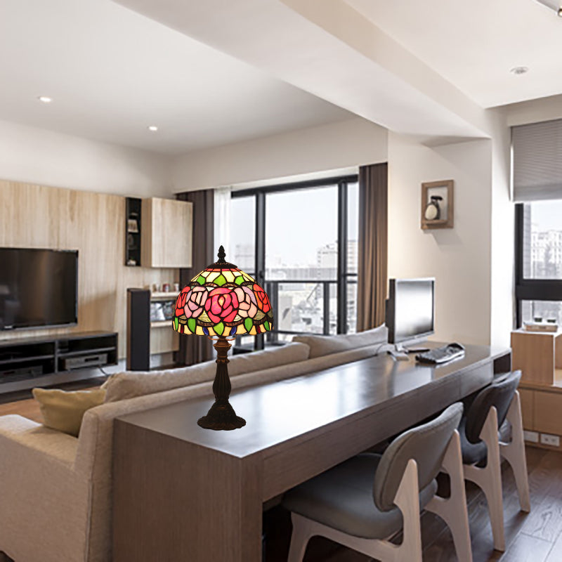 Lampe de table de nuit à tête unique en laiton antique avec vitrail méditerranéen au design rose rose/rose rouge/tulipe pour table de chevet