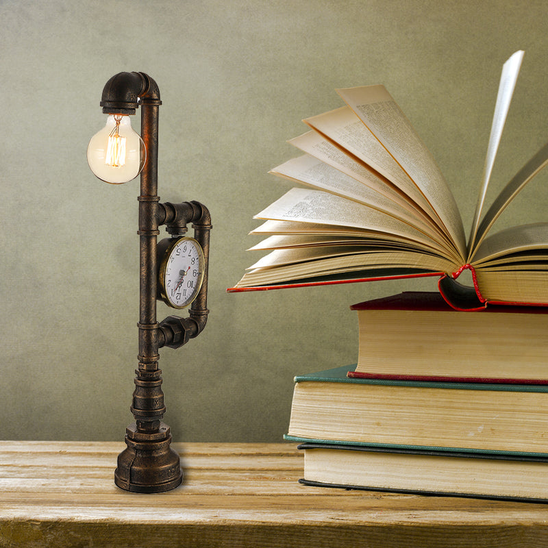 Rustic Wrought Iron Water Pipe Table Lamp With Clock - Brass 1 Head Light