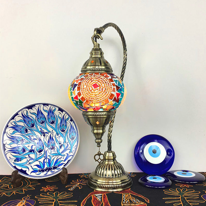 Cette lampe est fabriquée avec une finition en laiton et a un aspect de métal antique. C'est une lampe de travail qui a une ampoule et est livrée avec un abat-jour boule de verre coloré. La tension de cette lampe est de 110 V-120 V et la base est E12/E14. C'est aussi une lumière LED.