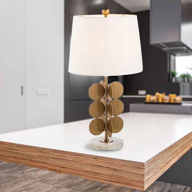 Petite lampe de bureau en laiton avec base en métal circulaire - Liseuse 1 tête de style traditionnel, abat-jour en tissu blanc