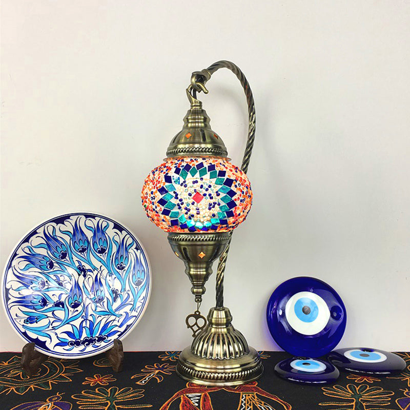 Traditional Curved Arm Metal Desk Lamp With Ball Glass Shade - Brass Finish Blue