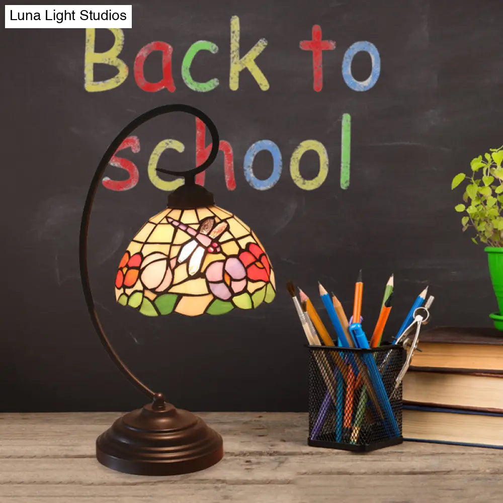 Lampe de table de nuit bombée en verre taillé méditerranéen - Libellule café foncé et lampe de bureau à motifs de fleurs
