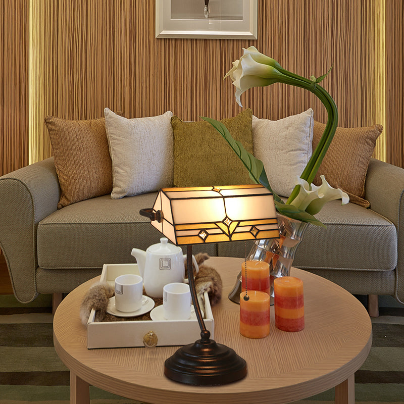 Cette lampe de table comporte une seule tête avec un vitrail de style Tiffany. L'abat-jour est blanc et en verre, tandis que la base est blanche et en vitrail. La lumière est LED, incandescente ou fluorescente. Cette lampe de table est également équipée d'une chaînette.