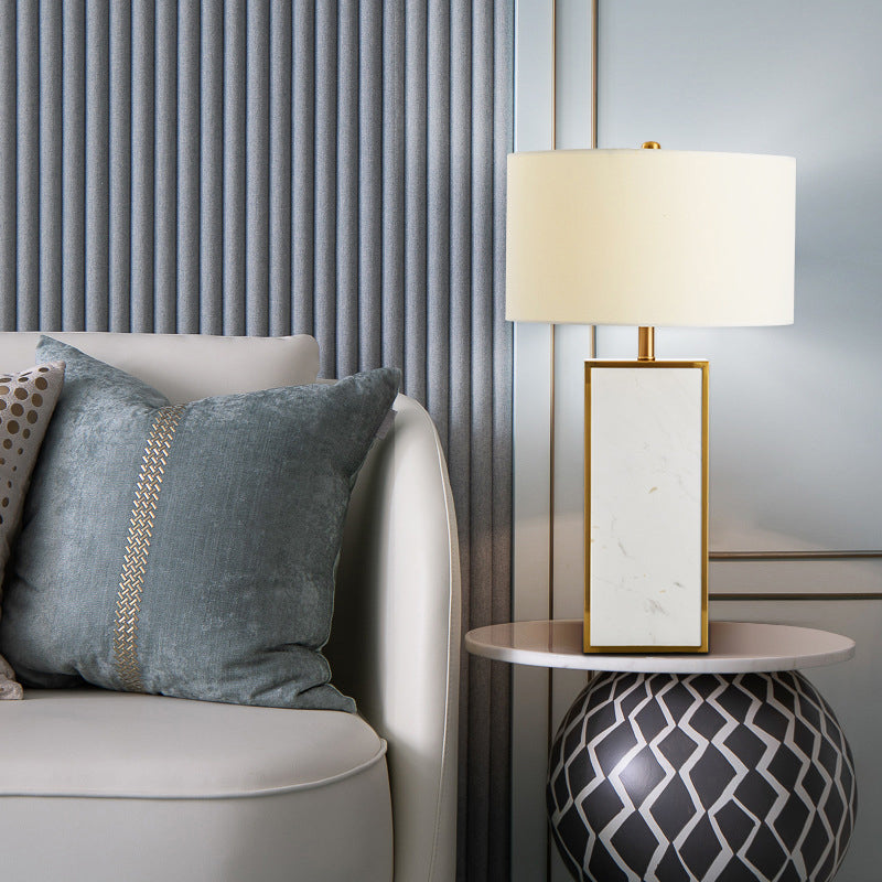 Lampe de table contemporaine en tissu blanc avec tambour en pierre : éclairage de table de chevet élégant à 1 tête pour le salon.