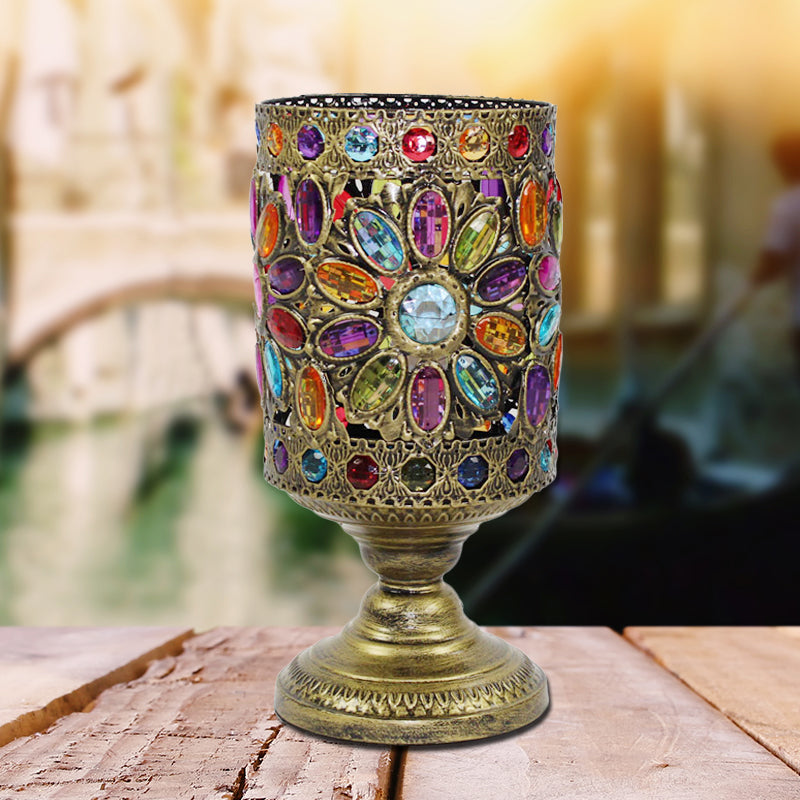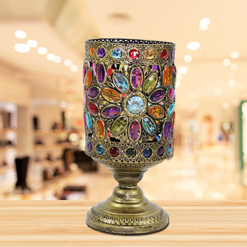 Ce produit est une veilleuse cylindrique en laiton. Il est en métal et possède un abat-jour en métal multicolore. Cette lampe est de style Art déco et mesure 13" de long et 6,5" de large. L'ampoule n'est pas incluse, mais elle prend un culot E12 ou E14 et peut être de type LED, incandescente ou fluorescente. Cette lampe est destinée à un usage intérieur uniquement.