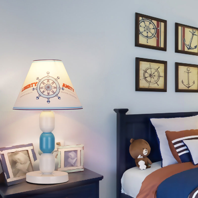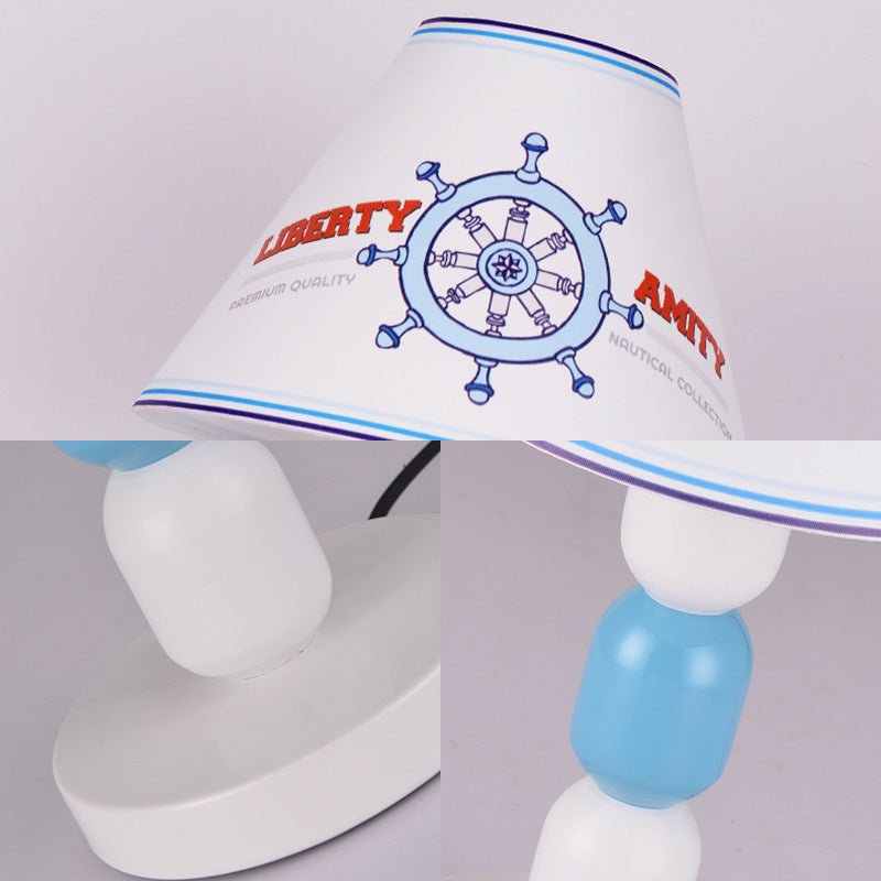 Lampe de table élégante à abat-jour conique blanc avec motif gouvernail/dinosaure de bande dessinée - 1 lumière, tissu et métal