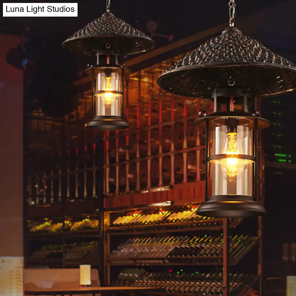 Suspension rustique noire avec cylindre en verre transparent et décoration en forme de chapeau pointu, ampoule simple