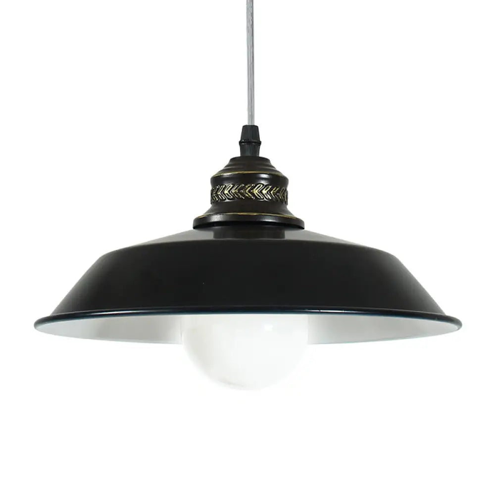 Ce produit est une suspension élégante en forme d'abat-jour de grange en métal et de couleur noire. Il est disponible en deux tailles différentes, 10 ou 14 pouces de diamètre. Il utilise une ampoule LED, à incandescence ou fluorescente d'une puissance maximale de 60 watts et a une tension de 220 V-240 V ou 110 V-120 V. Il a une longueur de chaîne/cordon de suspension de 39 pouces.