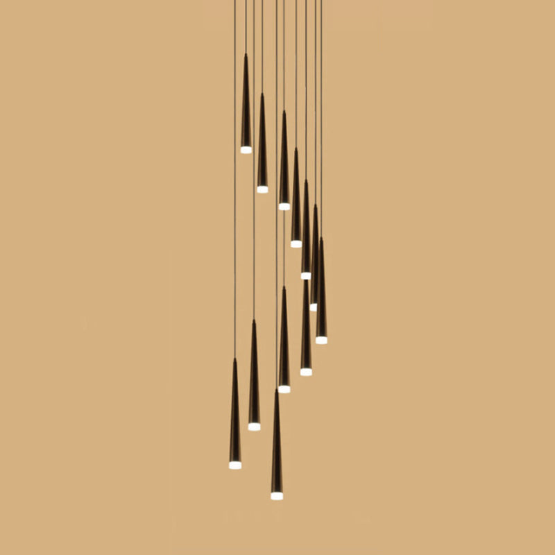 Il s'agit d'une lampe suspendue en acrylique noir en forme de cône avec 9, 12 ou 18 lumières. Elle a un design en spirale contemporain et est destinée à être accrochée dans un escalier. Elle peut utiliser des ampoules LED, à incandescence ou fluorescentes (non incluses). La largeur du luminaire est de 19,5 à 23,5 pouces, la hauteur du luminaire est de 79 à 118 pouces et la forme de la verrière est ronde.