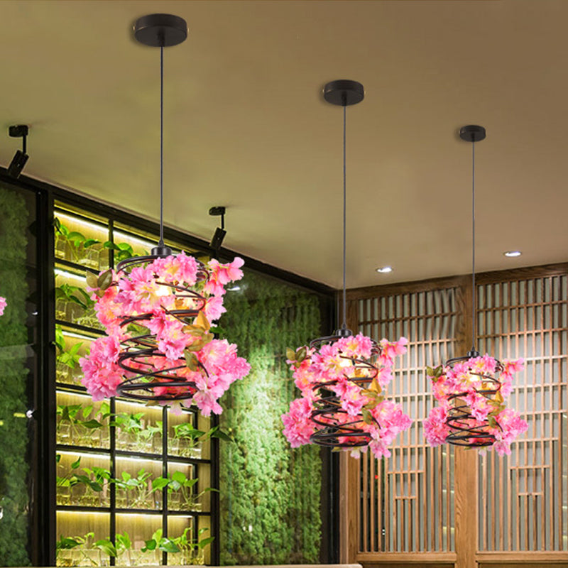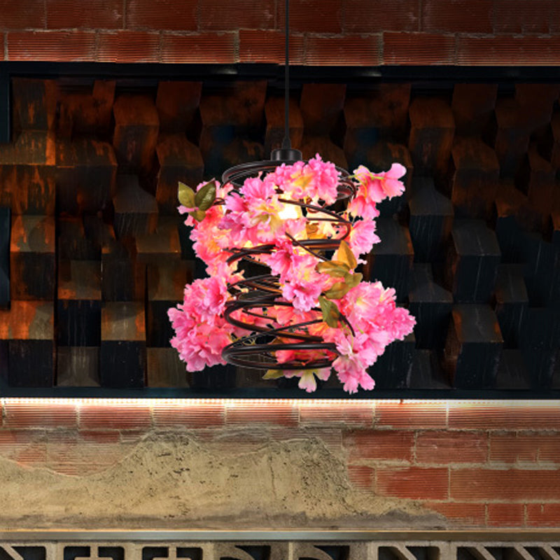 Vintage Metal Spiral Pendant Ceiling Light With Led Flower Design In Black