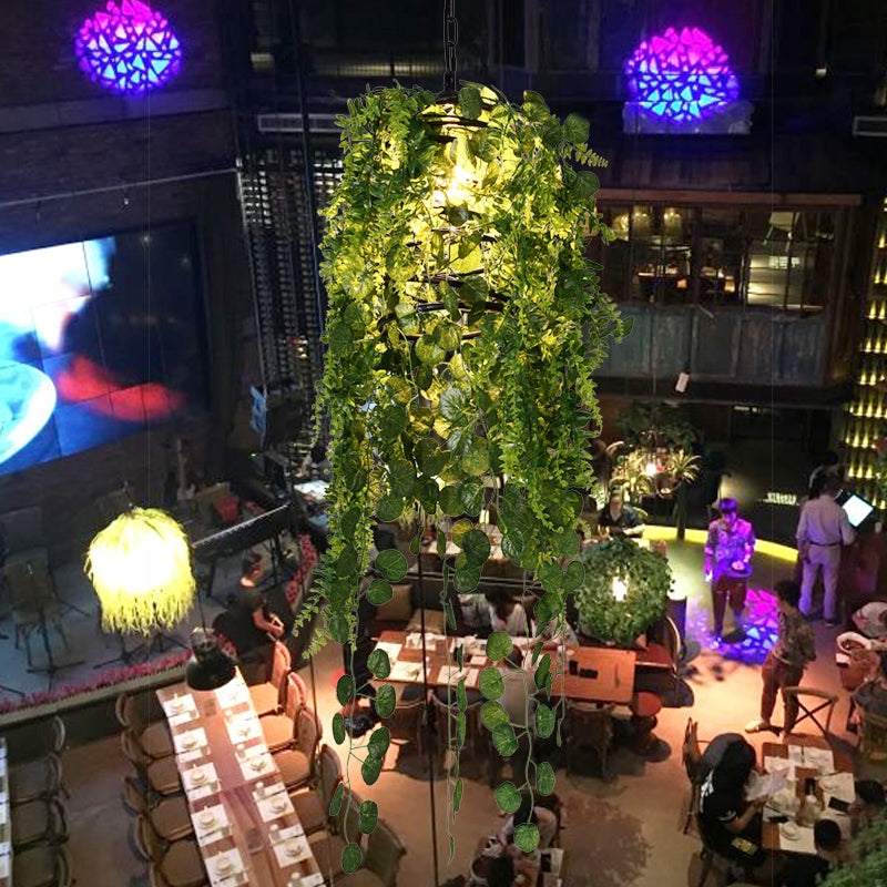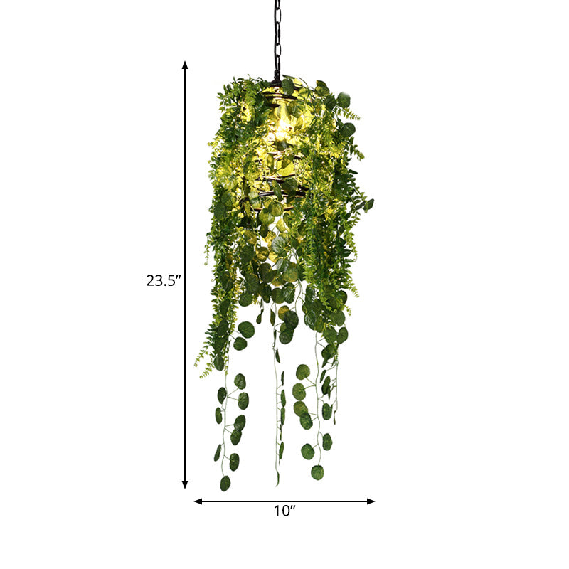 Industrial Black Cage Pendant Light With Led And Plant
